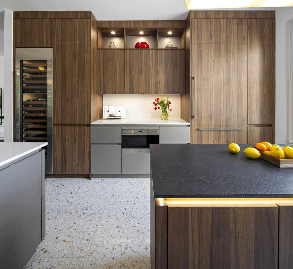 The selection of the wood-textured look of the Walnut Le Midi laminate finish juxtaposed with the metallic acrylic Pearl Citrine finish makes a beautiful impact and creates a custom aesthetic that adds a sense of luxury, while still being practical and durable for everyday use.