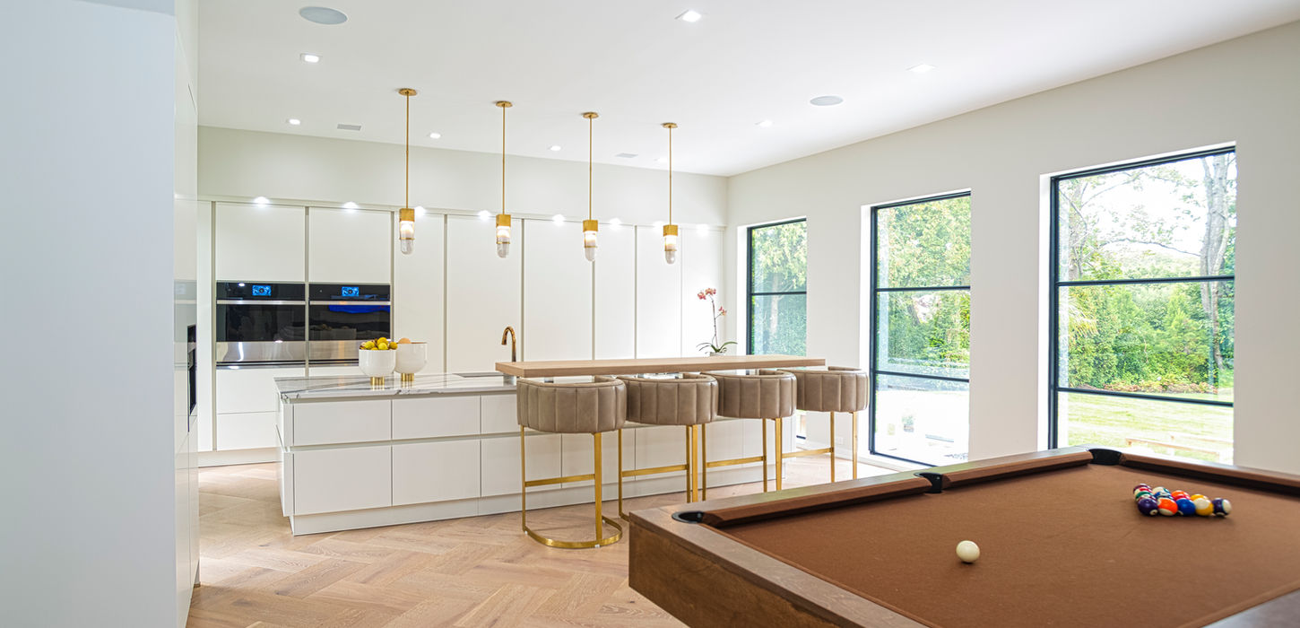 This open concept layout provides a spacious, open environment for this European Modern Kitchen. This layout emphasizes connectivity and easy flow between spaces, ideal for socializing or multitasking. Beautiful white cabinetry create a fresh, contemporary look. German Cabinets in the slab door style, contribute to a streamlined, minimalist appearance.