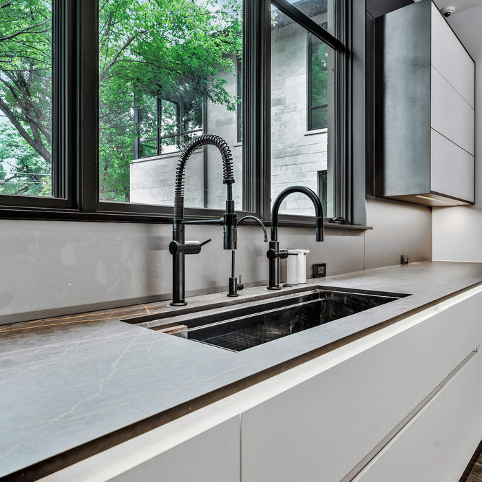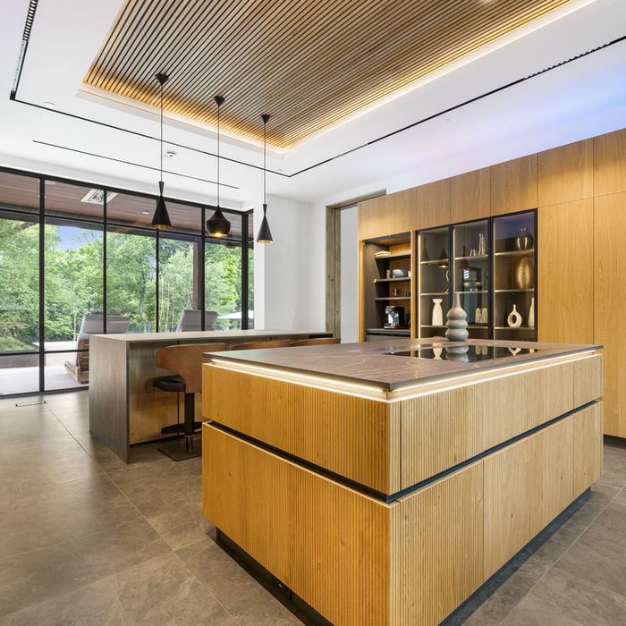 Beautiful Bossa Alpine Oak cabinets create a luxurious atmosphere with their textured wood tonality and upward linear movement. Tall Antique Bronze Vero glass cabinets with Carbon Grey interior provide exciting contrast and decorative interest. F-45 Nimbus warm white cabinets framed in Steel Ferro finish for the upper cabinets and sink wall bases add yet another layer of architectural depth to the space. Explore our extensive kitchen catalog, featuring a variety of styles including elegant European kitchens, designed to elevate the aesthetics and functionality of your home.
