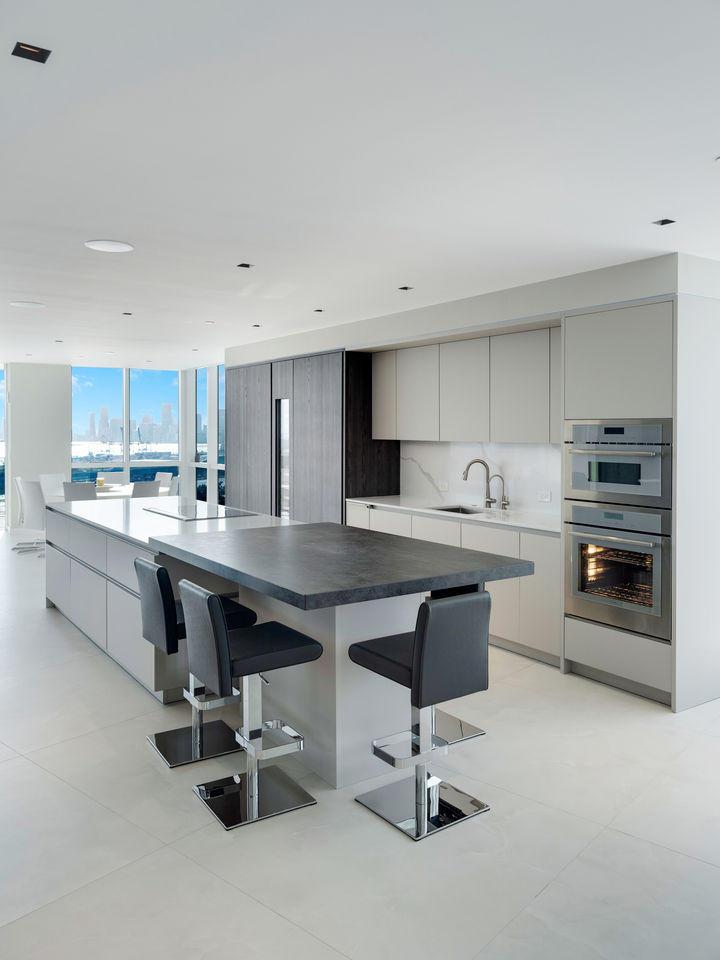 To create a contemporary well fitted kitchen with a bar area and itemized storage on the 29th floor home of a waterfront luxury building. Clients wanted to keep a mostly light finish not to distract from expansive views of the Miami water inlet and marina.