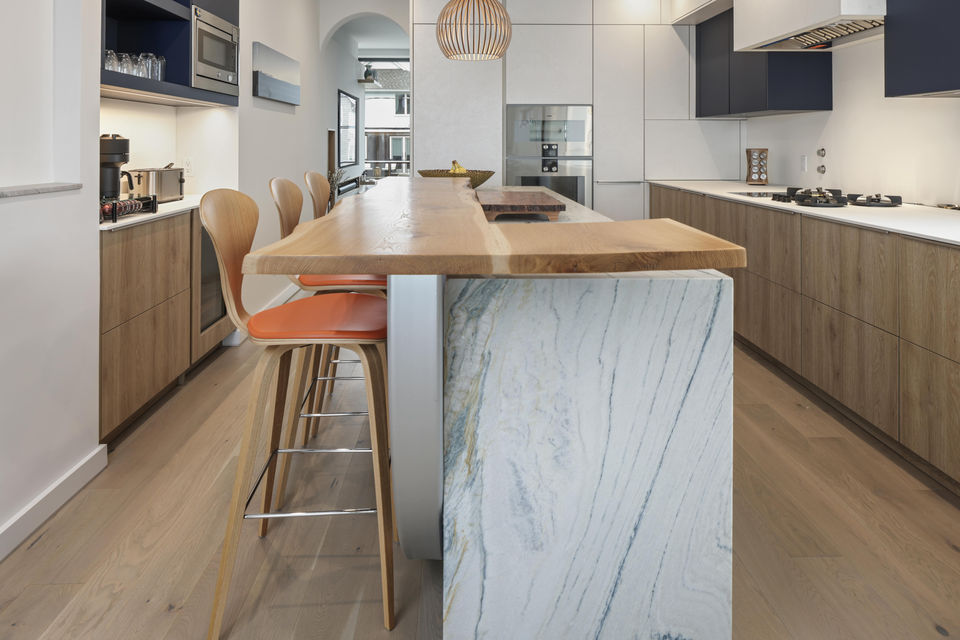 The large focal-point sculptural island stuns. There are two different height surfaces that create separate functional areas for prep and eating. The expressive waterfalled stone counterop with organic veining, offers a durable work surface, and the raised, almost floating live-edge wooden top adds natural warmth and a beautiful contrast. And the 2 pendants glow with perfection.
